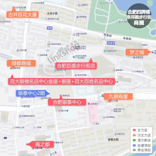 4大主力店約57億:合肥銀泰中心17.3億,百大鼓樓名品中心金座+銀座(原百大樂普生)+百大百姓名品中心近20億,商之都(吞并了一旁的金鷹)約12億,合肥百盛步行街店約8億