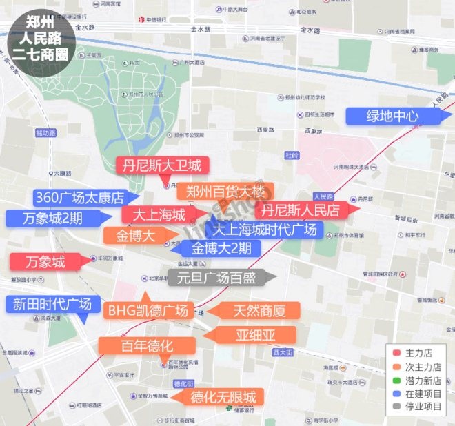 7大次主力店:金博大6億,BHG凱德廣場,百年德化,鄭州百貨大樓,亞細(xì)亞,天然商廈,德化無限城。停業(yè)商場:元旦廣場百盛。