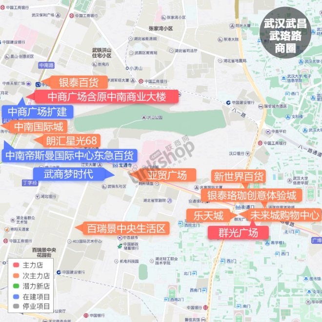 武珞路街道口占據(jù)著武昌區(qū)的商業(yè)交通核心樞紐位置,其商業(yè)發(fā)展一直備受關(guān)注。因商圈次主力商場較多,競爭激烈。