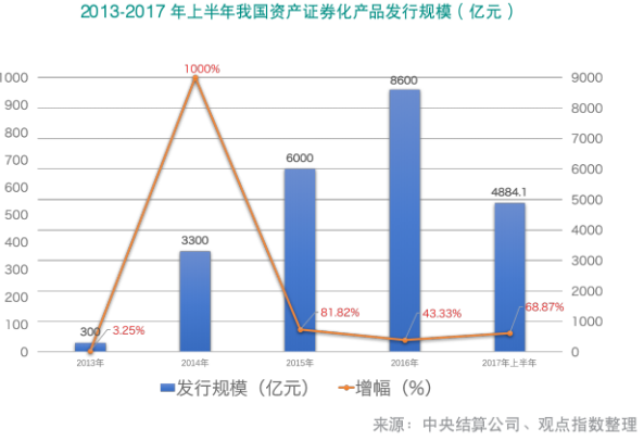 根據(jù)中央結算公司的數(shù)據(jù)統(tǒng)計,2013-2016年,我國資產(chǎn)證券化發(fā)行額逐年遞增,由2013年300億元上漲至2016年的8600億元,增長近28倍。截至2017年上半年,全國共發(fā)行資產(chǎn)證券化產(chǎn)品4884.1億元,同比增長68.87%,市場存量為14624.78億元,同比增長66.48%。