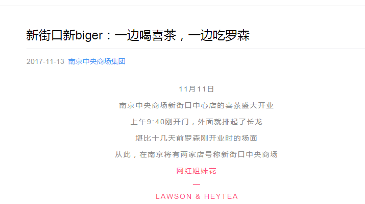 喜茶開(kāi)業(yè)后的第二天,中央商場(chǎng)新街口店官方微信就創(chuàng)造性的提出了“一邊喝喜茶,一邊吃羅森,一邊逛中央”的概念,此概念一出,使的如今八十多歲的中央商場(chǎng),一股年輕時(shí)尚的氣息撲面而來(lái)。